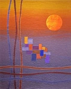 Having grown up in Japan, this influence is evident in her style and use of kimonos, silks, ikats, hand dyed and batik fabrics. She includes traditional techniques of quilting as well as her own contemporary methods. She does all her piecing, applique and couching on a domestic sewing machine and her quilting on a long arm quilting machine.